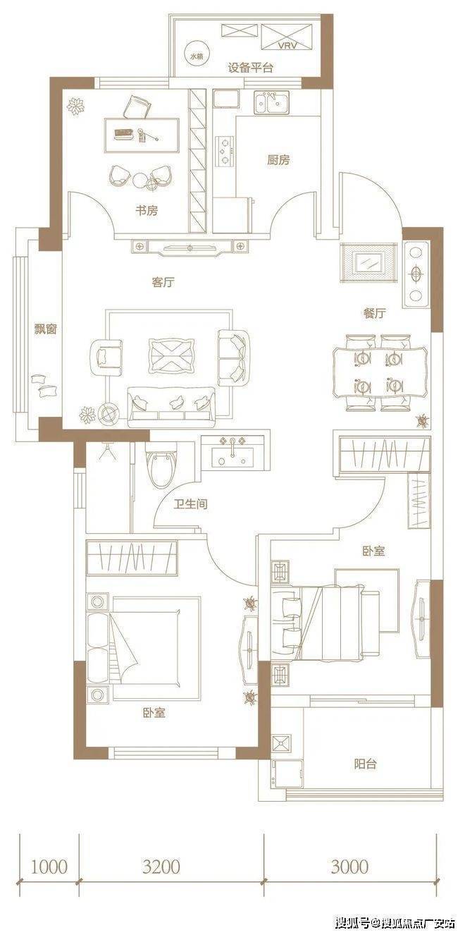 建面约89㎡户型图另一个从力三房户型,建面约103㎡,若是要为它的舒服度打分,几乎能够打满分。